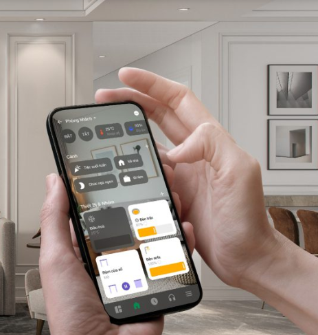 Kiểm soát ngôi nhà từ xa chỉ với một chạm. Giao diện tiếng Việt trực quan, hỗ trợ cả iPhone và Android.