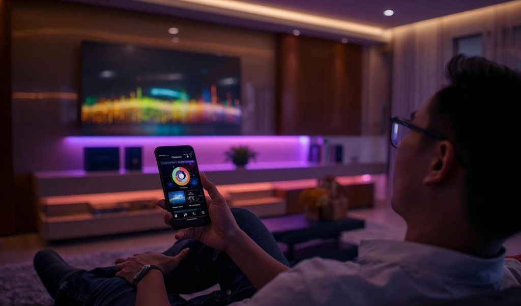 Âm nhạc “di chuyển” theo bước chân chủ nhân. Kích hoạt chế độ “Tiệc tùng” hay “Thư giãn” chỉ với một chạm: Đèn chuyển màu, nhạc nổi lên, biến phòng khách thành không gian Chill đúng nghĩa.